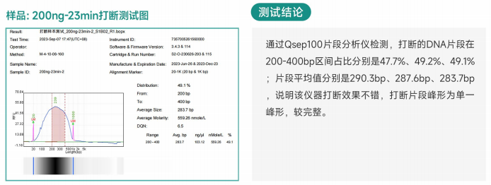 現針對提取的一管全血DNA樣本,投入量分別是200ng加入到0.2ml離心管中,具體實驗條件及打斷后的片段分布圖如下: