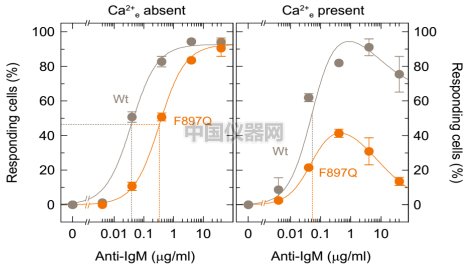 圖三: 由圖中曲線可以看出,在沒有胞外Ca2+存在的時候,對BCR的刺激(加入 BCR抗體 anti-IgM)和B細胞中鈣離子活動成比。而當有胞外Ca2+的時候(加入1mM CaCl2)胞外對于胞內鈣離子的活動也有非常顯著的影響,會隨著Anti-IgM的升高,胞內鈣離子濃度會降低。 |